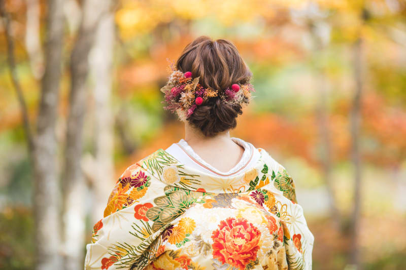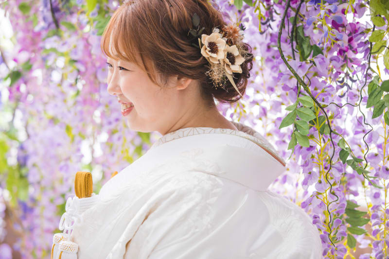 人気ナンバー1の柔らかいシニヨン×ドライフラワー。