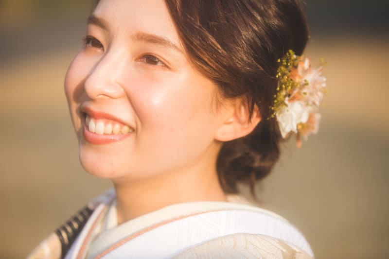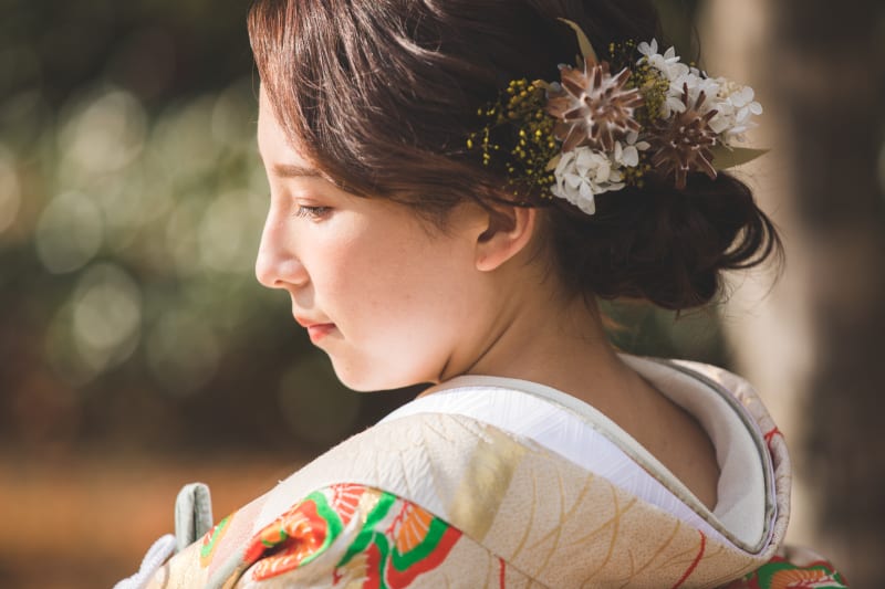 メイクとお着物の組み合わせを邪魔しないように飾りは白グリーン系でまとめました。