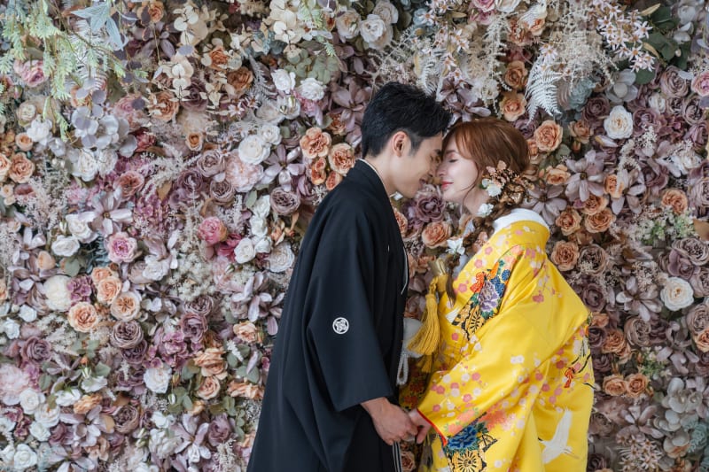 和装ハウススタジオというお花の背景で色打掛を2着お召しいただきました✨