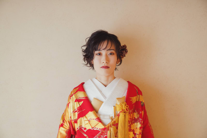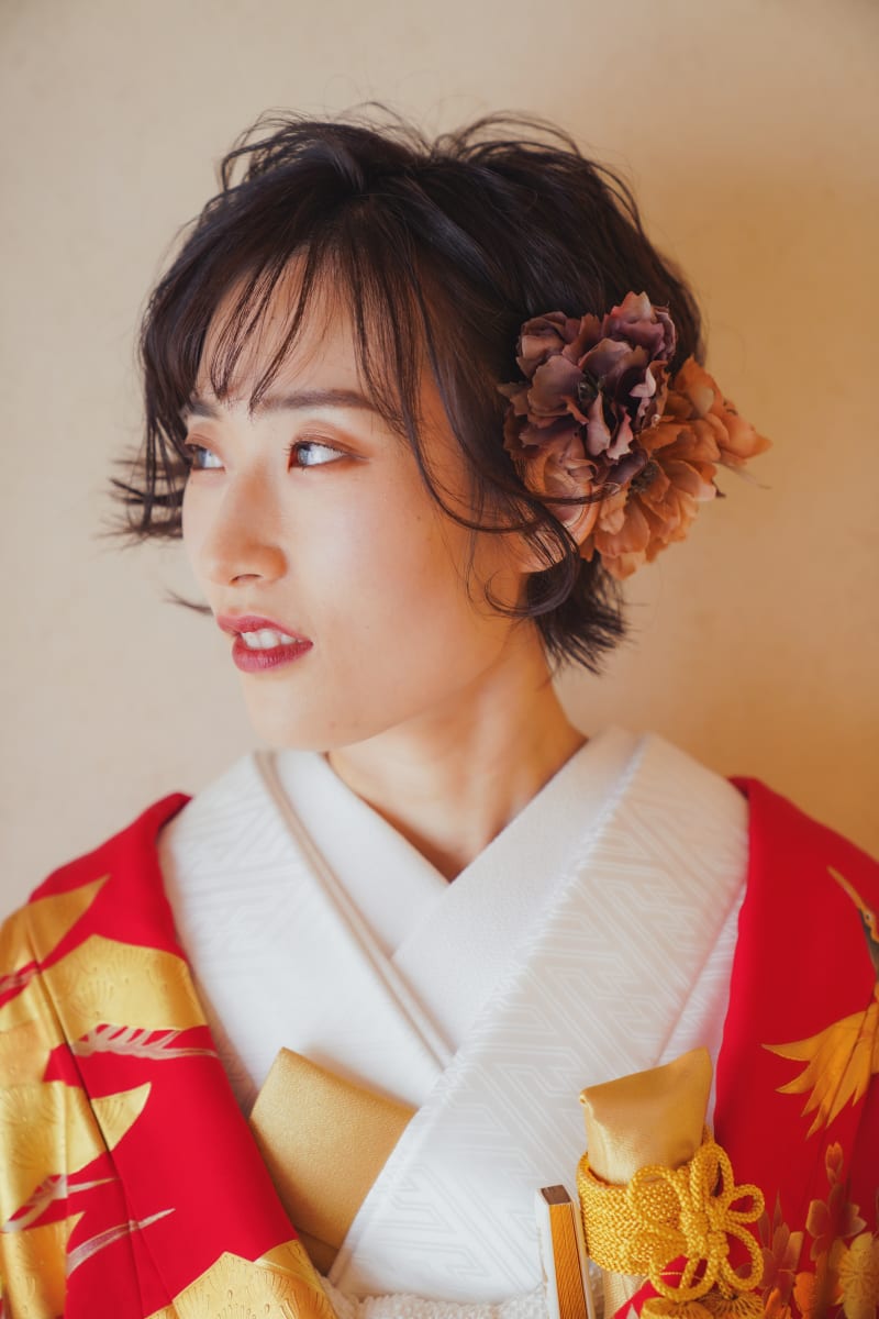 色打掛が赤の色味がはっきりとしているので、メイクでもお着物と合うようにキメました。