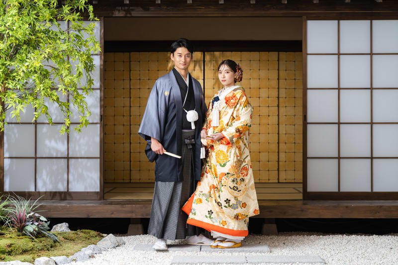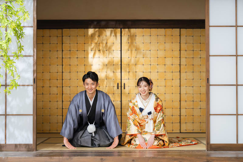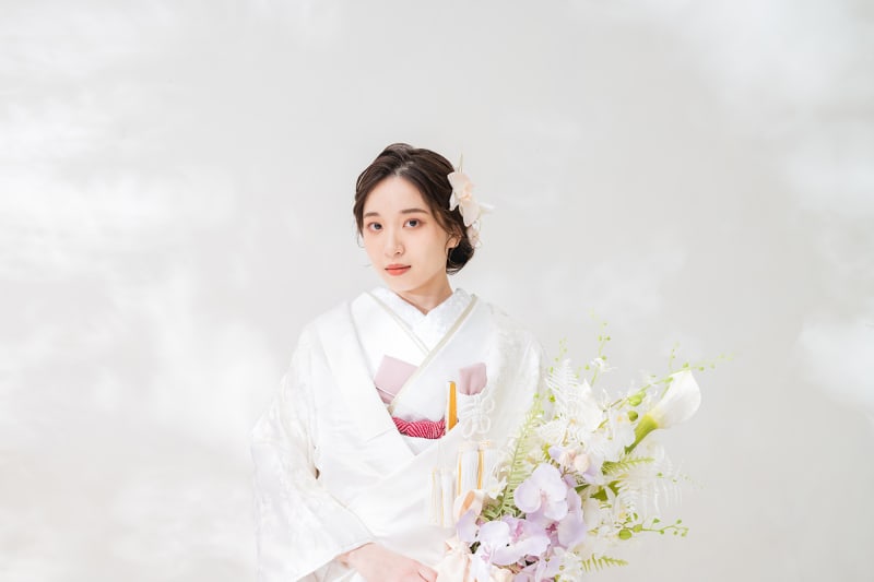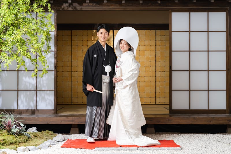 白無垢で白壁に木漏れ日を落としてスッキリシンプルに撮影することもできます。