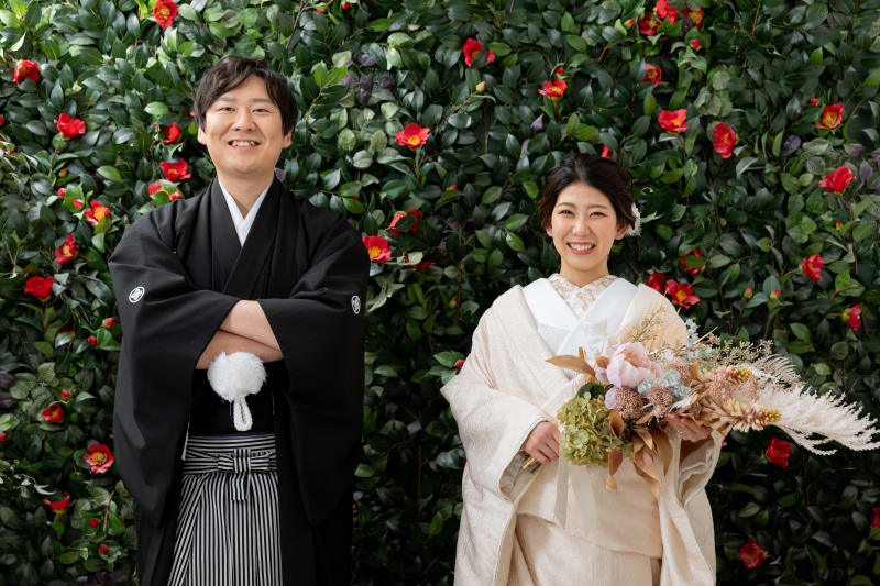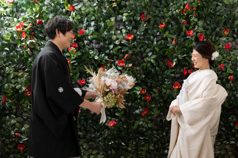 椿の壁の前で、新郎様にブーケをプレゼントしていただいたシーンです。
