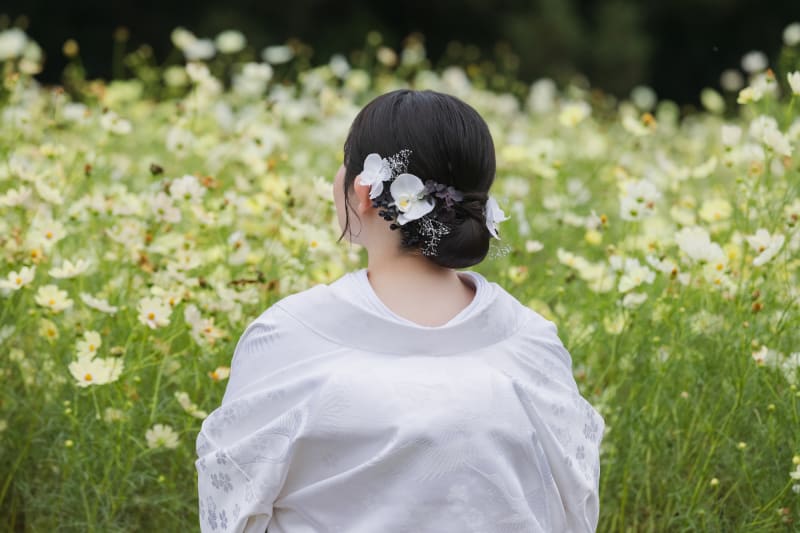 コーディネートがシンプルでしたので、髪飾りにはあえて色味をたしてみました。
