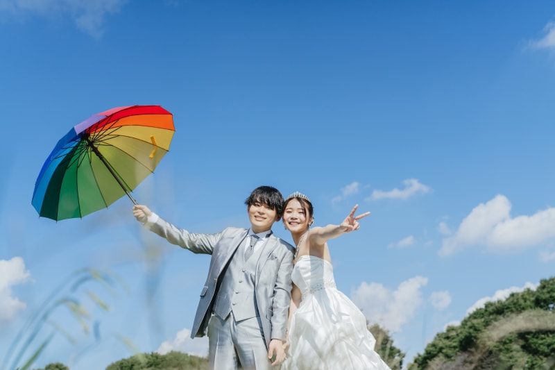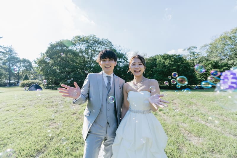 風に舞うシャボン玉が、まるで二人の幸せを祝福しているかのように見えますね◎
