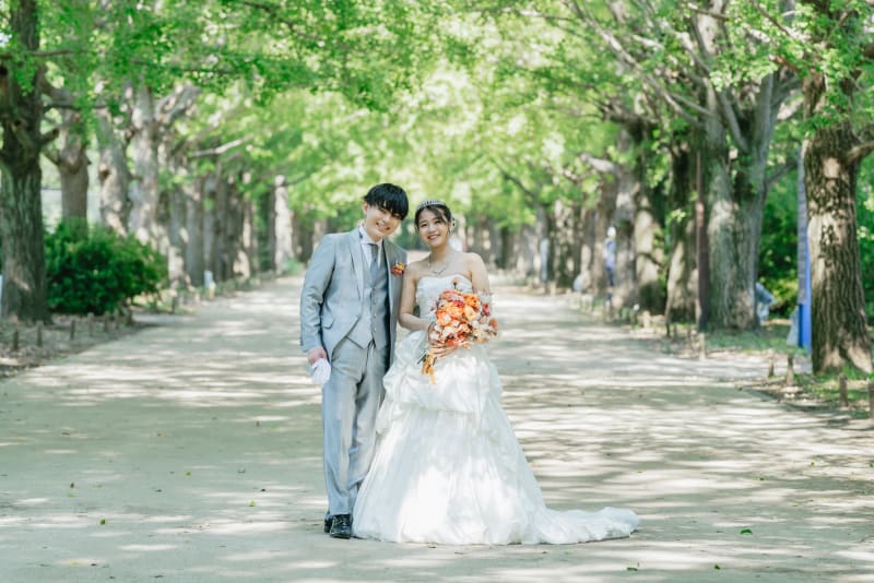 銀杏並木はまだ青々としていますが爽やかな雰囲気がお二人にとても似合っていました✨