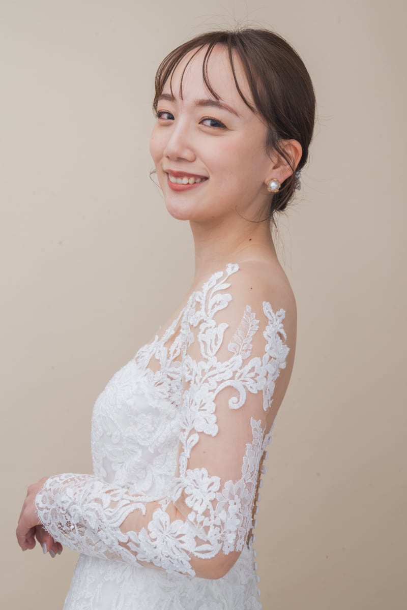 イリュージョンレースが施されたロングスリーブが、軽やかさと華やかさを印象づける一着。