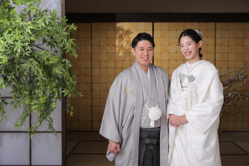 新郎様も、新婦様の衣装の雰囲気と合わせてシルバーの紋服に。