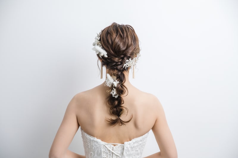 髪飾りはビジューのものをメインにドライフラワーとミックスして雰囲気をあわせてみました。