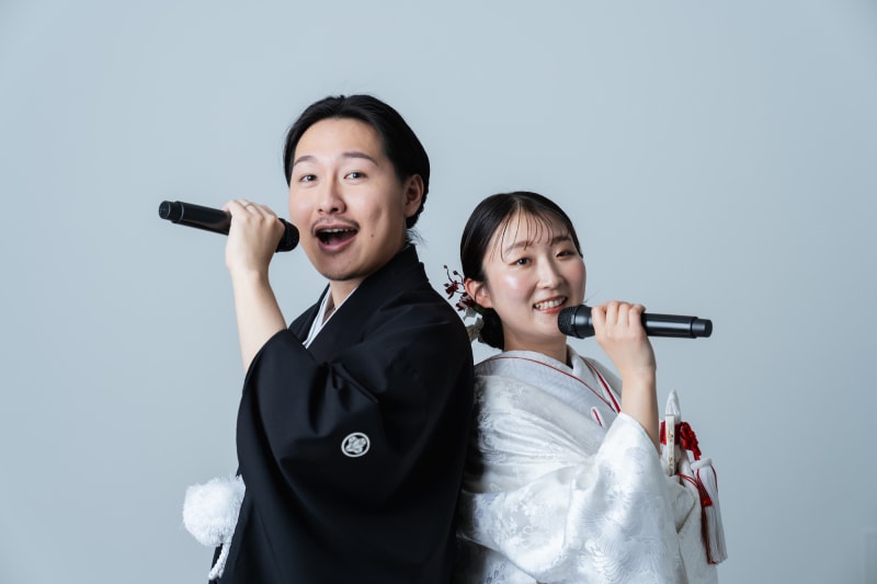 お二人の共通の趣味“アカペラ”にちなんでマイクを持ってのショット。