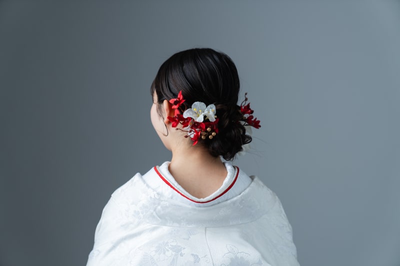 シンプルなシニヨンスタイルに、お着物と小物に合わせた赤と白の造花で大人可愛く♪