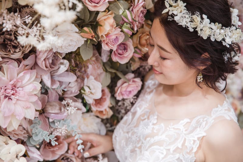 ドライフラワーの花かんむりと毛先にもお花を散りばめました。