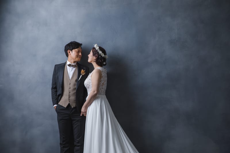 新婦さんはレースのデザインがとっても素敵なドレスに、新郎さんはチャコールグレーのシックなタキシードにチェンジです!