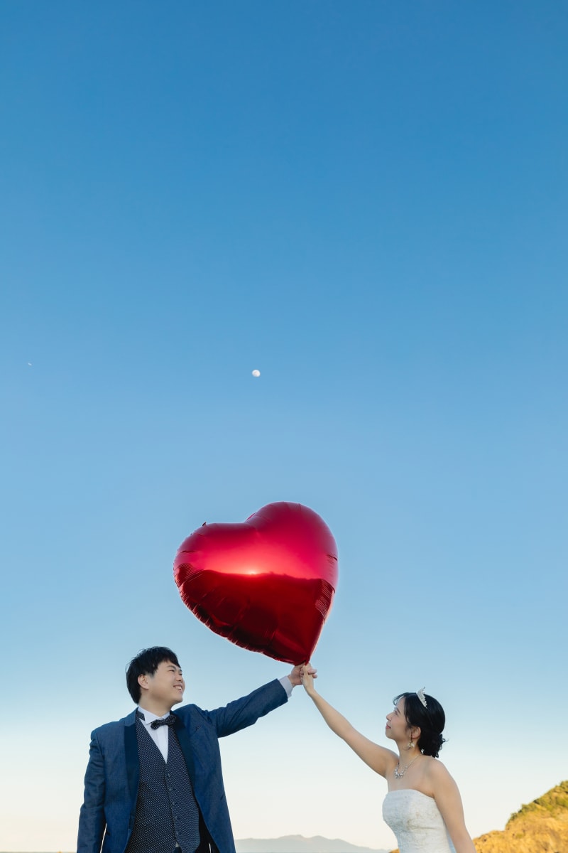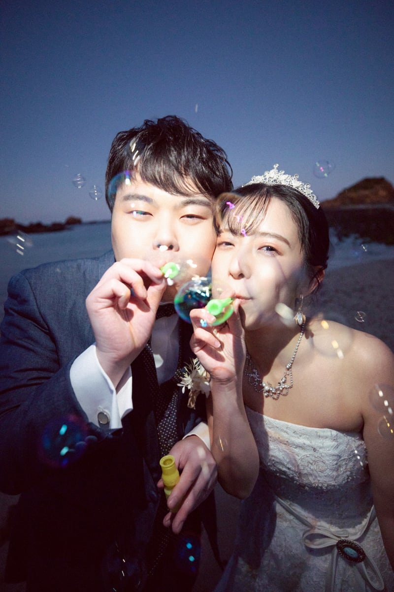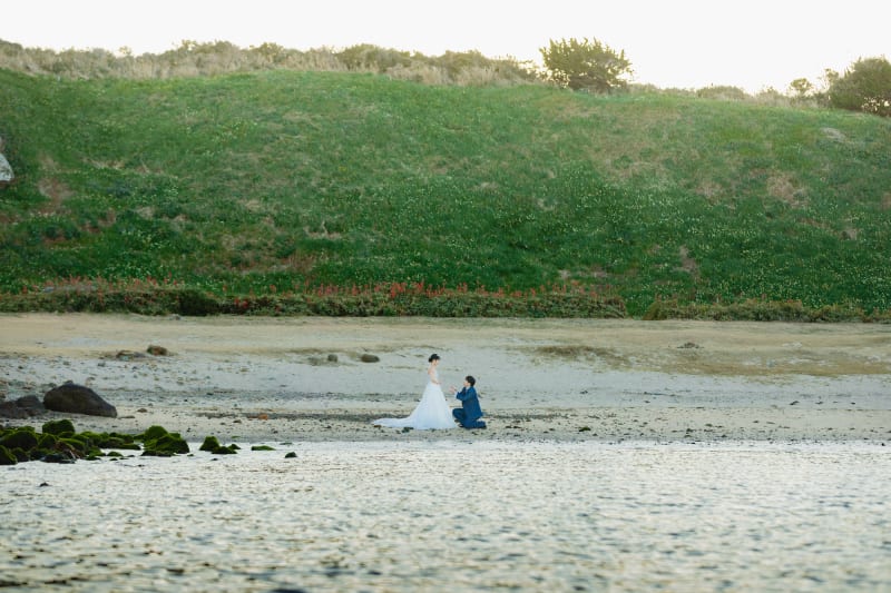 広大な海でプロポーズショットやお持ち込みアイテムを使った写真です♡