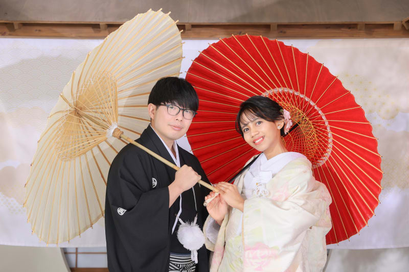 ご新婦様のリクエストで和傘を使った写真を撮りました。