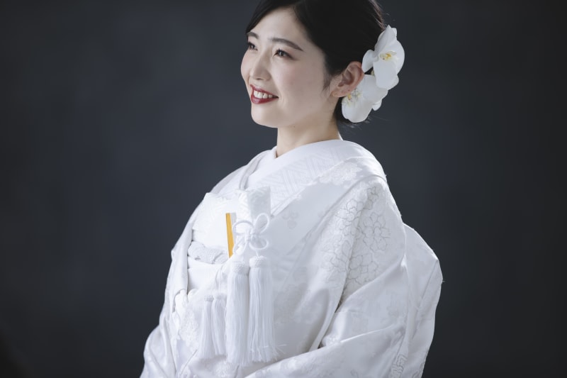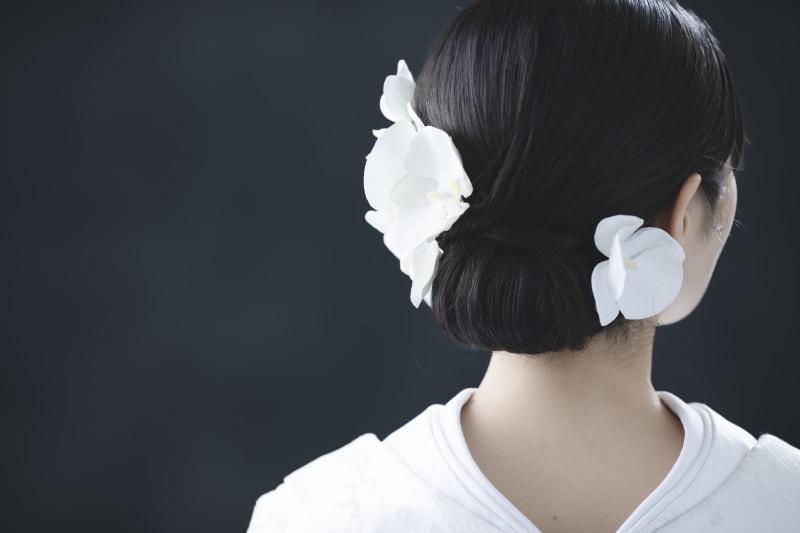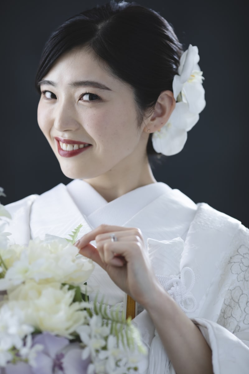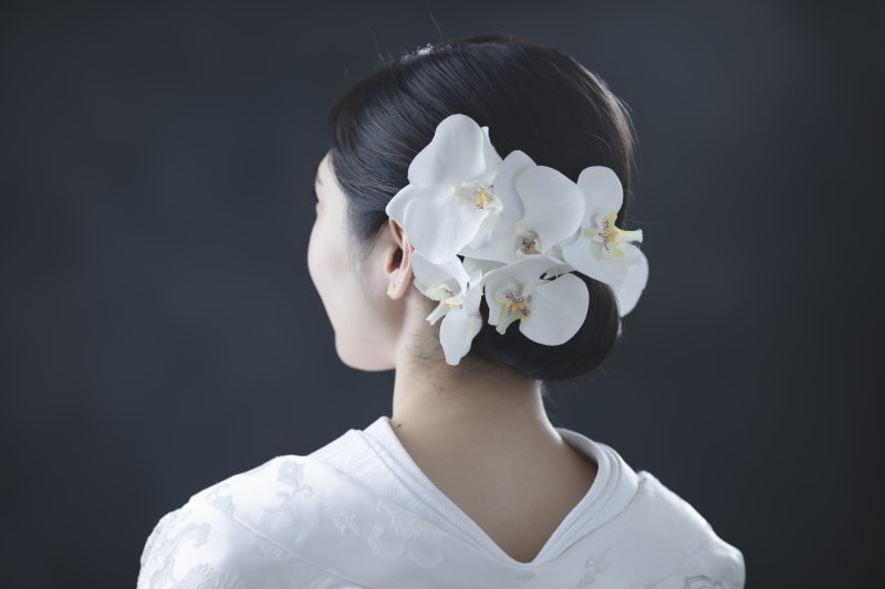 ヘアスタイルは和装ならではの【ツヤっとシニヨン】に白無垢と合わせて胡蝶蘭を組み合わ せました!