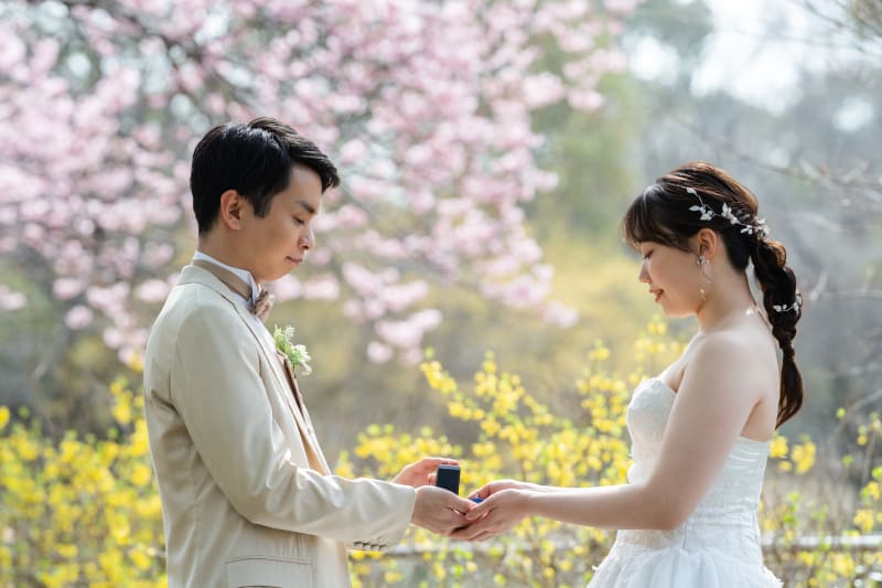春らしいピンクや黄色が背景に写るように撮影しました◎