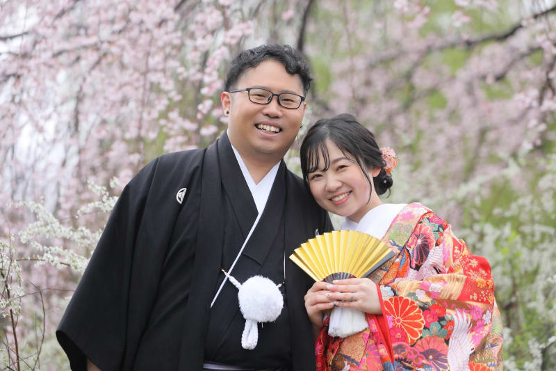桜の木の下で相合傘のお写真!!にこにこ笑顔が素敵です!!