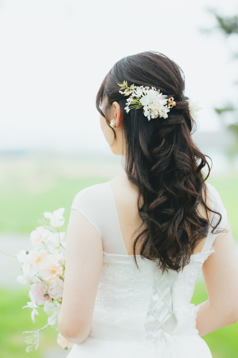 ロケーション撮影なので、髪飾りはお花にして自然と合うようにしました💐
