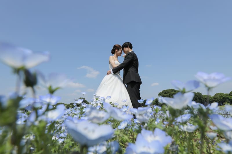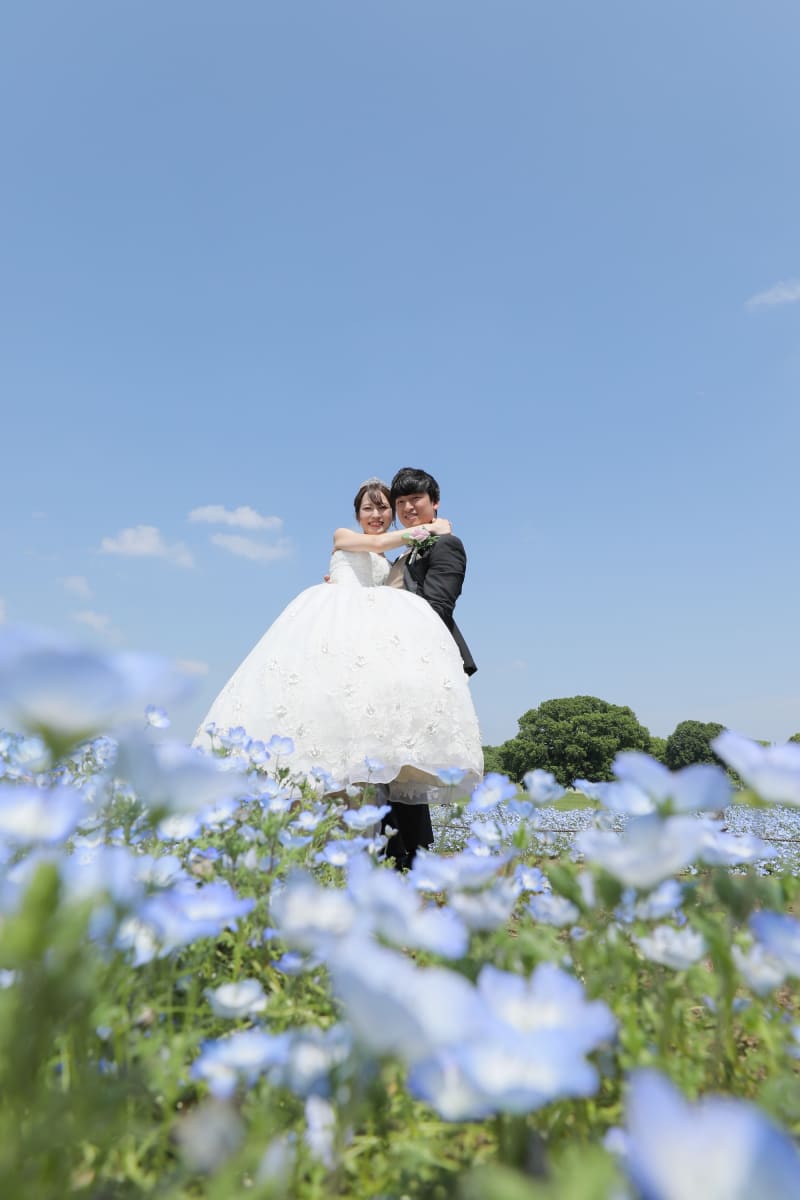 青空とネモフィラに囲まれながらの可愛い写真!!お二人もとっても幸せそう!!