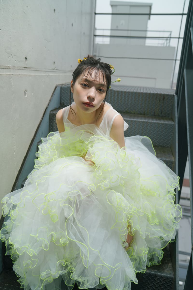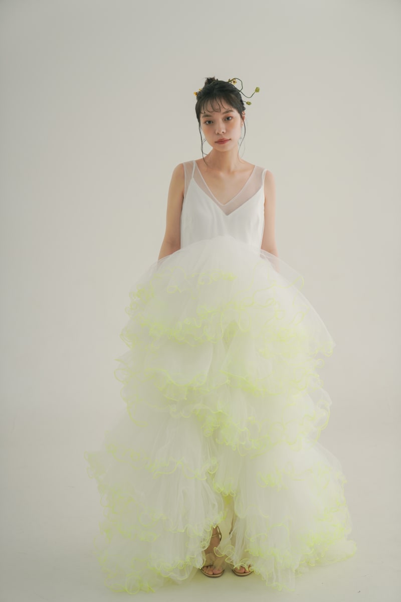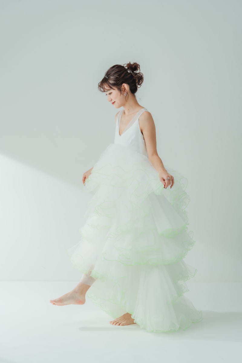 総チュールのギャザーがたっぷり入っていてボリュームのあるデザインが特徴のドレスです。