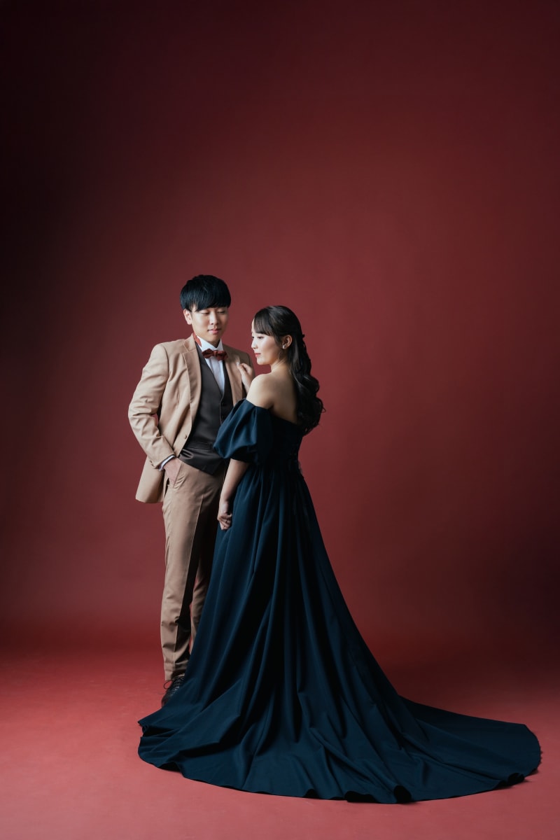 濃い色合いのドレスに赤背景がピッタリ◎