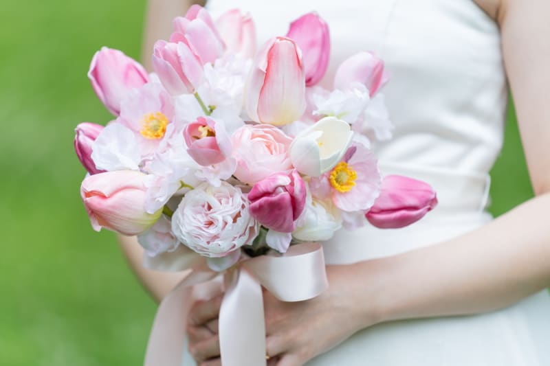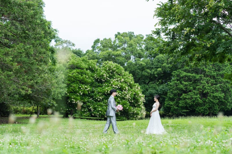 新緑のこの季節は、光がやわらかくて、背景のグリーンも本当にきれい。ドレスの白がすごく映えて、ナチュラルな雰囲気がふたりによく似合っていました。