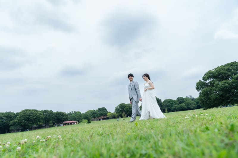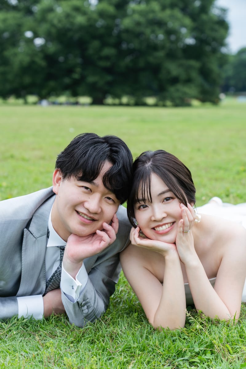 天気はちょっぴり曇り空でしたが、風もほどよくて暑さも感じず最高のロケーション。おふたりとも最初はちょっと緊張ぎみでしたが、芝生の上を歩いたり、おしゃべりしながら撮影していくうちに、どんどん自然な笑顔に。こういう瞬間って、見てるこちらも嬉しくなります。