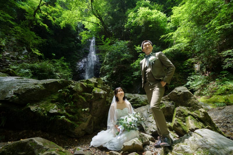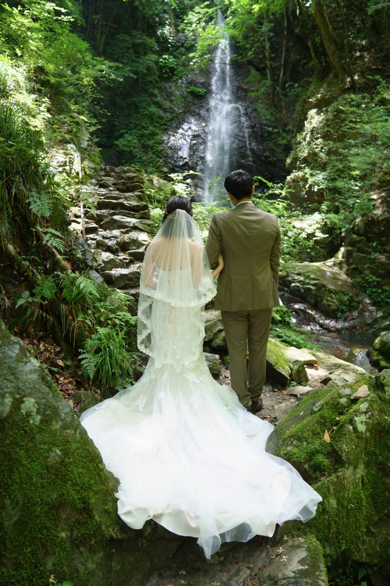 滝では新婦さんのマーメイドラインのドレスが映えていて綺麗でした⭐️