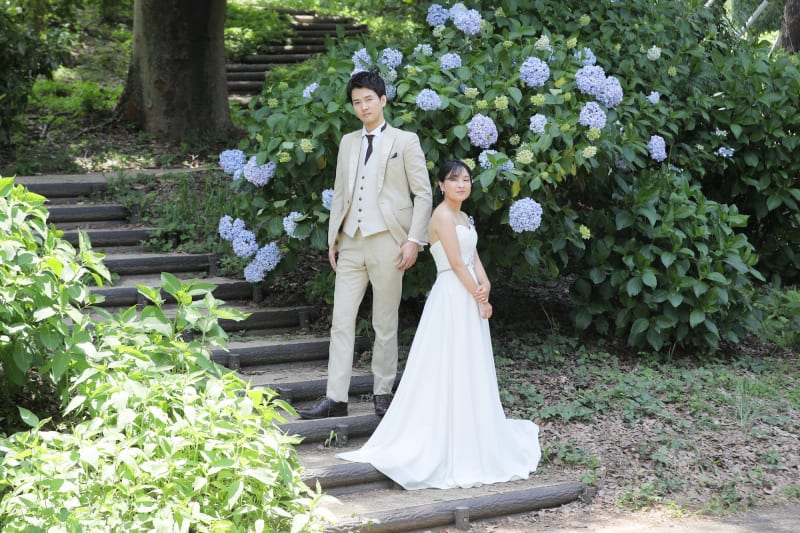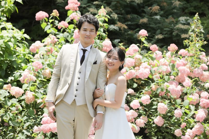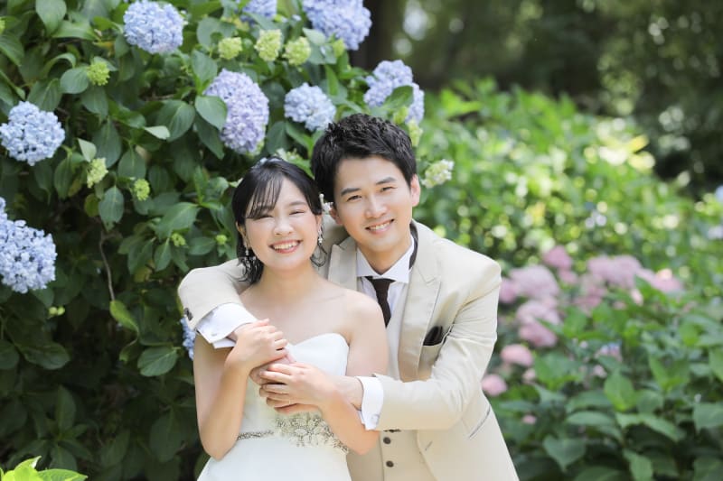 紫陽花のお花とバックハグ!お二人のニコニコの笑顔がとっても素敵ですね!!