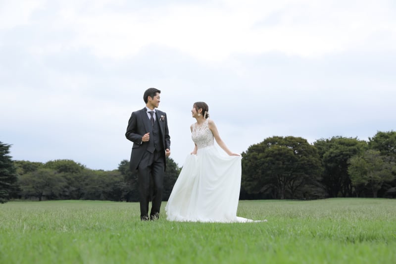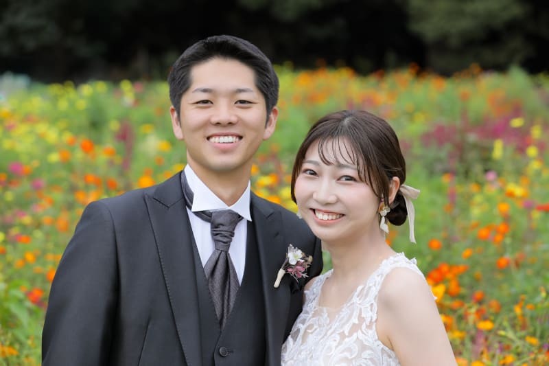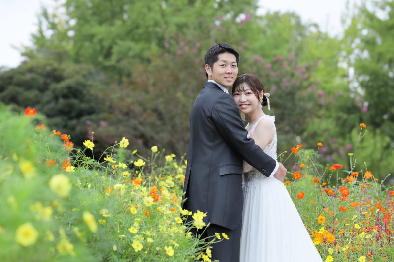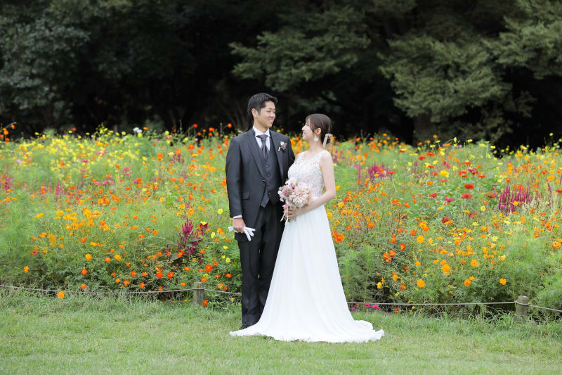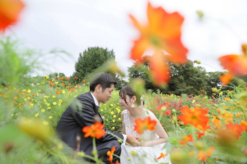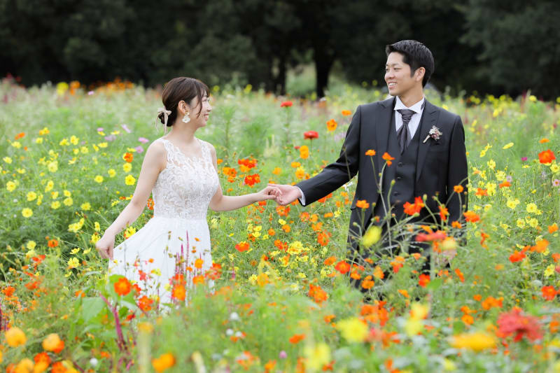 お花畑の中でお手繋ぎでお散歩したり、ぎゅっとしたり、お二人も自然と笑顔に!!