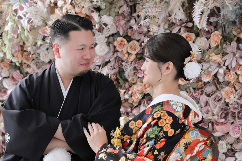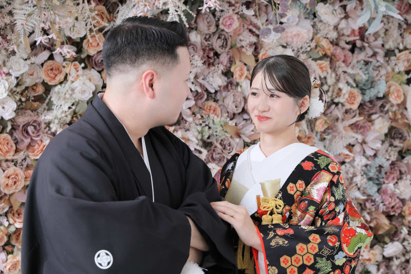 お持ち込みのブーケの濃いピンクのお花がアクセントになり黒色打掛によく映えます⭐️