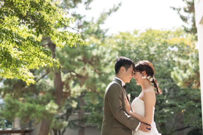 こちらは緑を背景にお二人の笑顔が見えお洒落な雰囲気で素敵ですね✨
