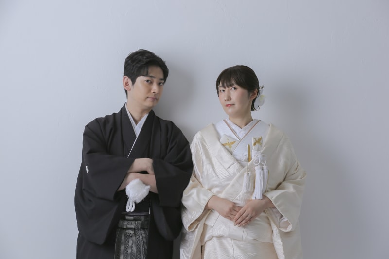 クールな表情のお二人がシックでとてもかっこよかったです。白無垢のコーディネートも素敵でした。