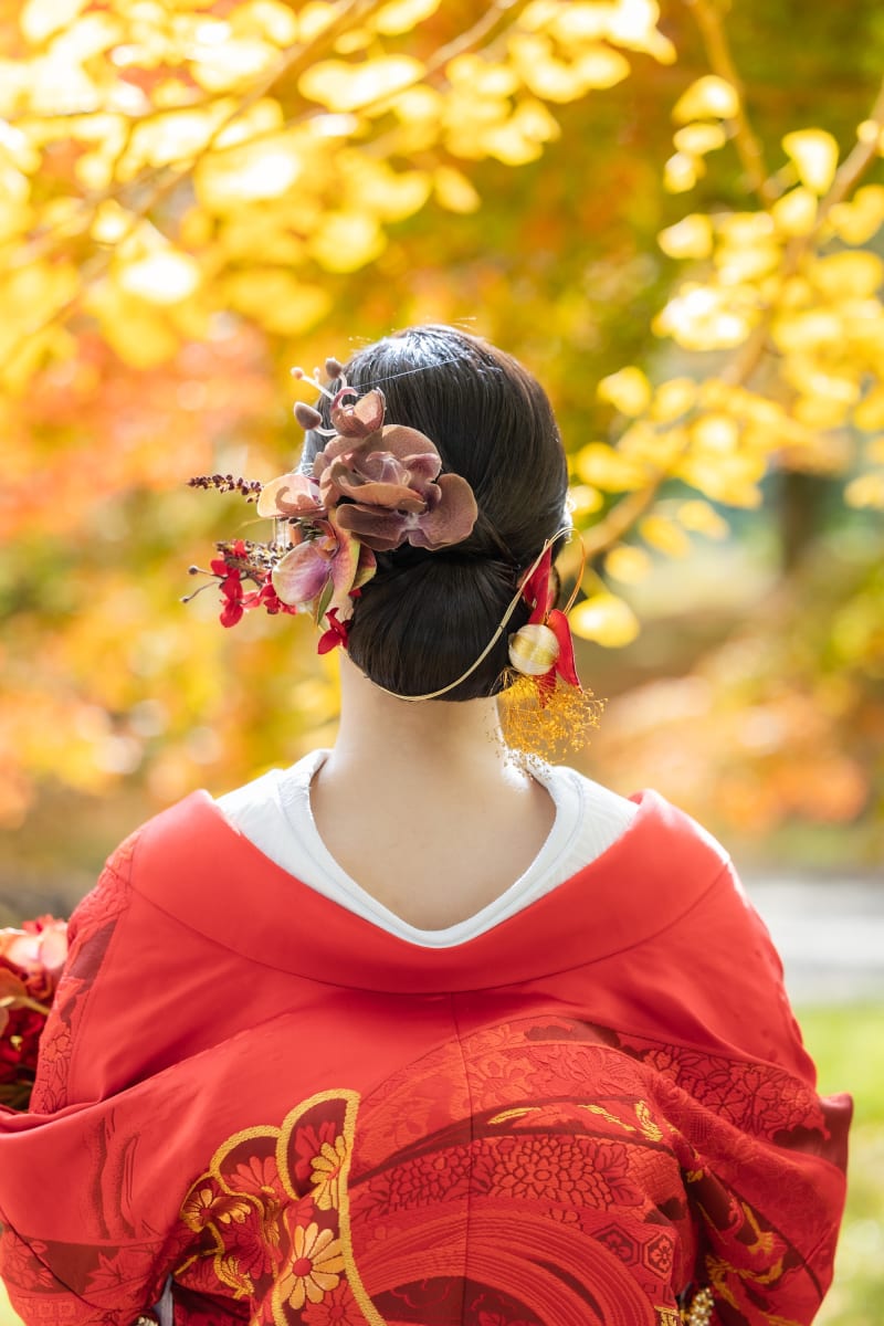 王道なタイトシニヨンに赤無垢とセットの髪飾り、少し個性を出すための水引がとても上品で存在感を放っていました。