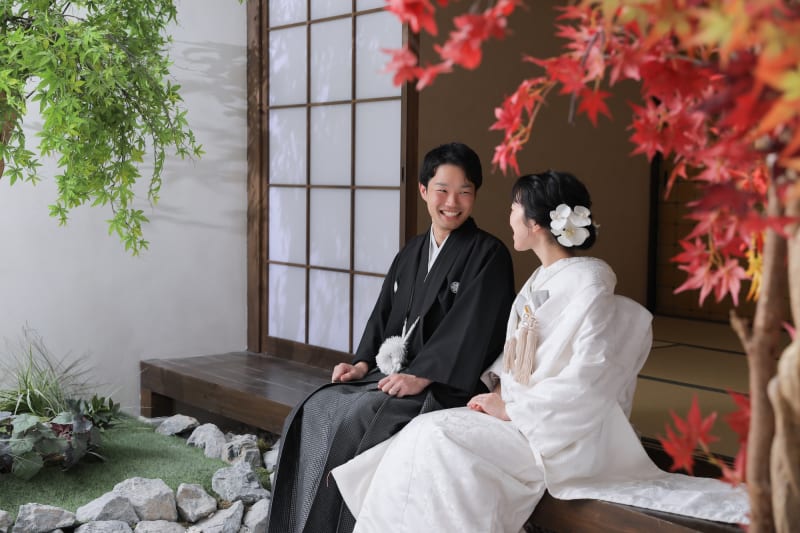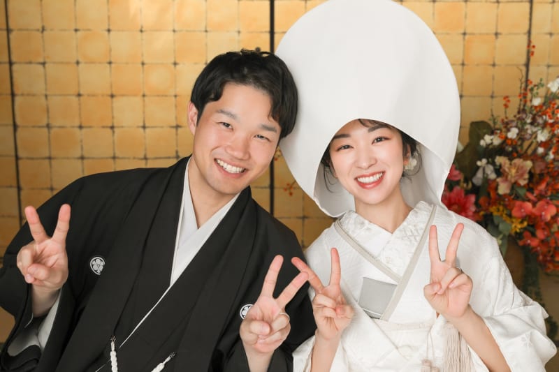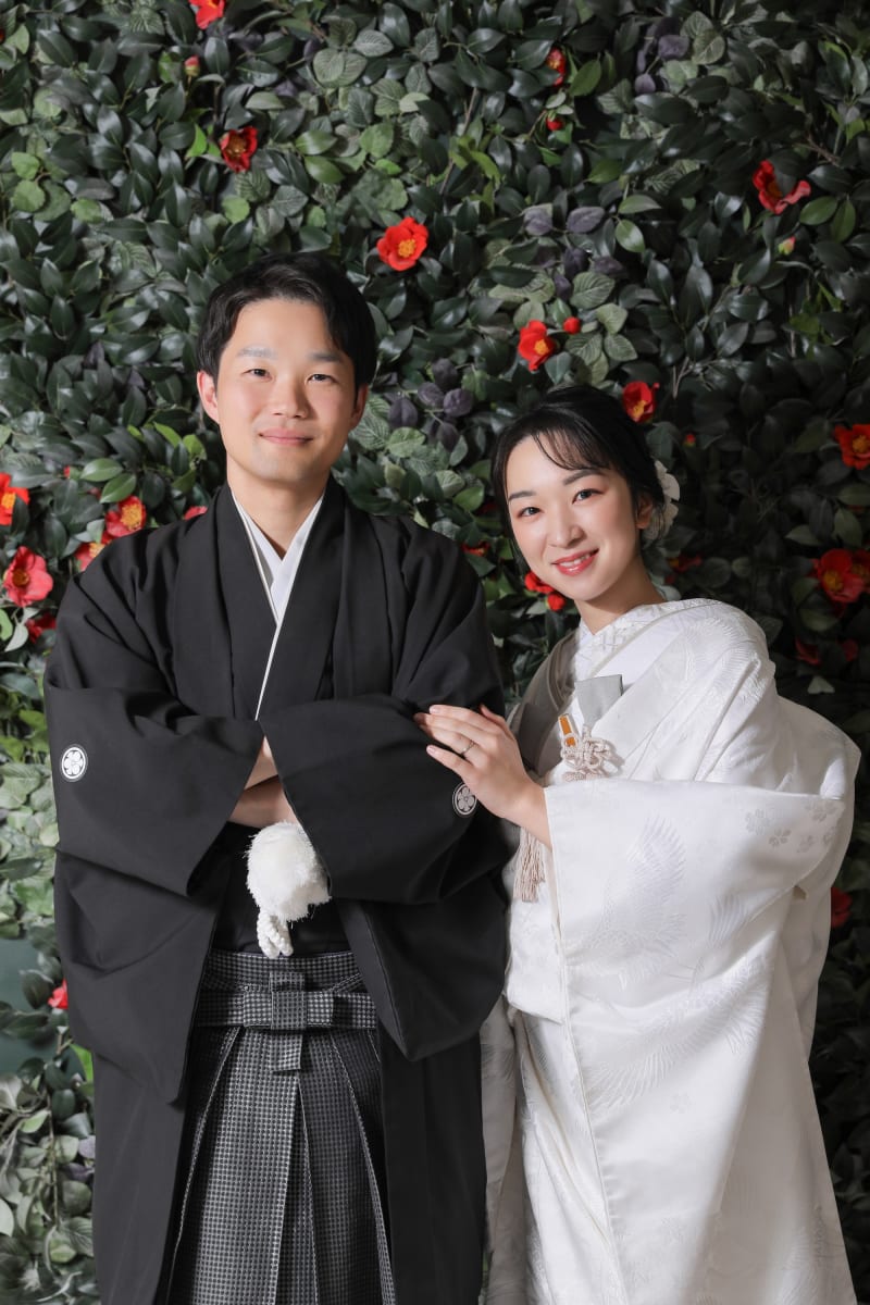 白無垢と淡い紫色の藤の花との相性がとてもよく、椿の背景とはまた違った雰囲気になりますよね。