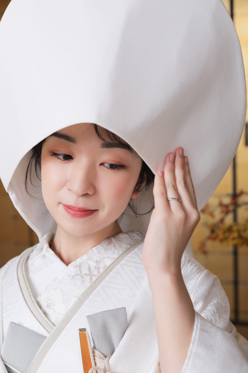 綿帽子、、、静かな和の空間で見せる綿帽子姿が、思わず見惚れるほど凛とした美しさでした。