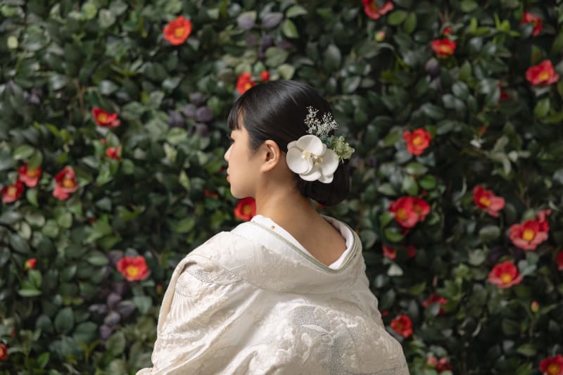新婦様の髪飾りは白無垢のコーディネートした襟元のカラーと合わせて白と緑を基調としたドライフラワーを付けました💚