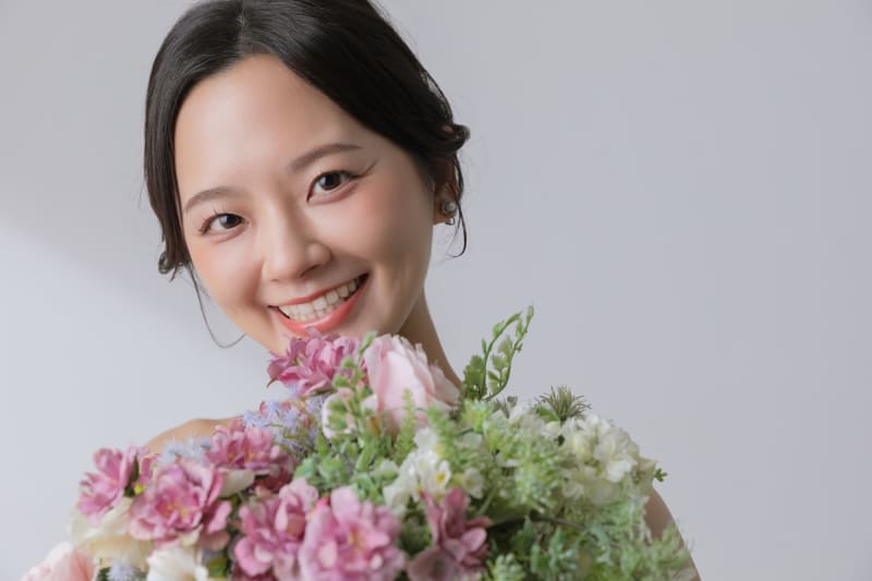 ブーケをお顔の近くに持ってお顔を傾げて。