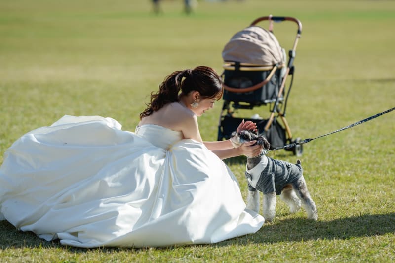 わんちゃんをなでるご新婦様