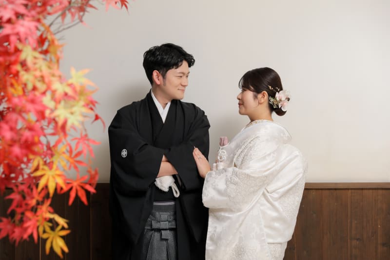 紅葉の奥にはお互い見つめ合うお二人の姿