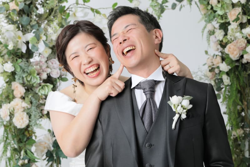 ご新婦様がご新郎様のほっぺをツンっと。お二人ともすごくすごく素敵な笑顔です。