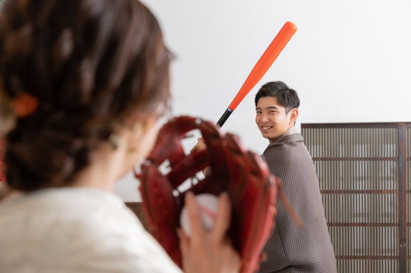 スタッフにボールを投げてもらい、ご新婦様のナイスバッティング風ショットです!