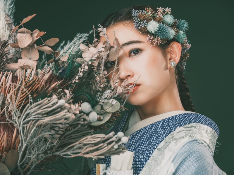 着物全体に施された大きな箔押しの花柄が美しい一着。
