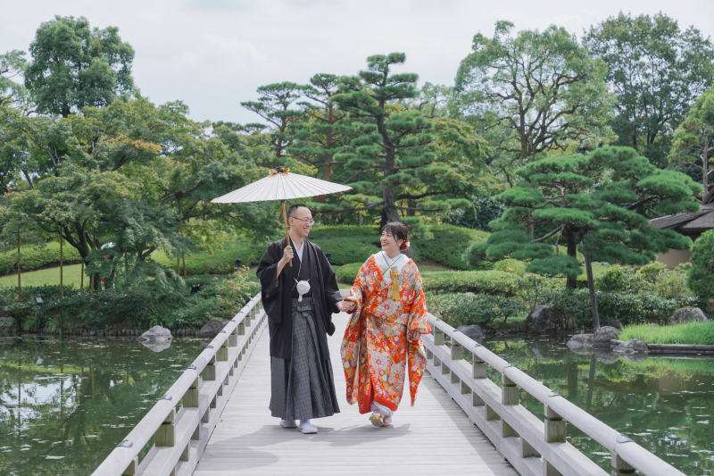 色のグラデーションが綺麗な橋の上で、お二人の歩いている雰囲気のお写真を撮りました!