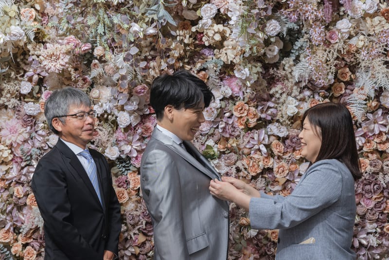 新郎様のお父様が新郎様にジャケットを着せてあげるシーン。