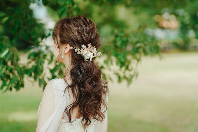カジュアルな雰囲気のドレスと、可愛らしいコスモスにピッタリなヘアスタイルでした^^