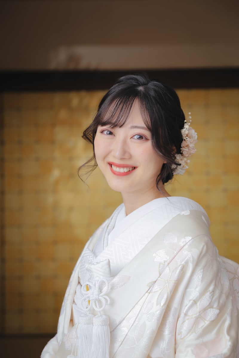 和装はピンクの色味の可愛らしいメイクと髪型は動きと顔周りの髪の動きを生かしたスタイルにしてみました。