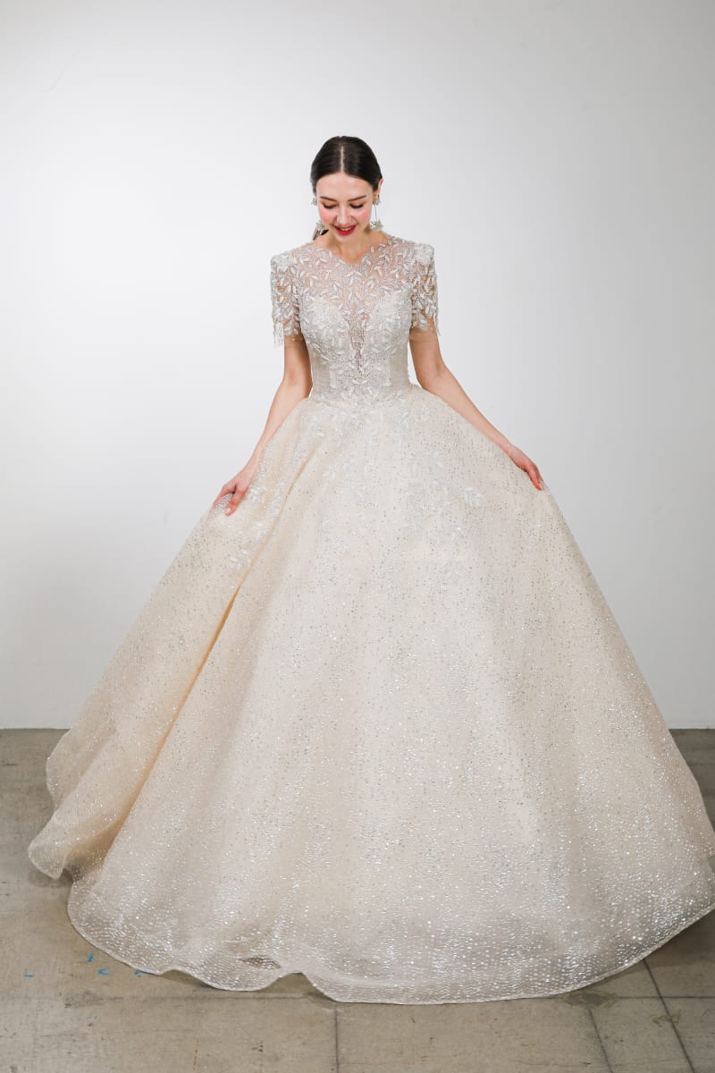 トなウェディングドレスです。重ねたチュールのボリュームに加えグリッターラメが360