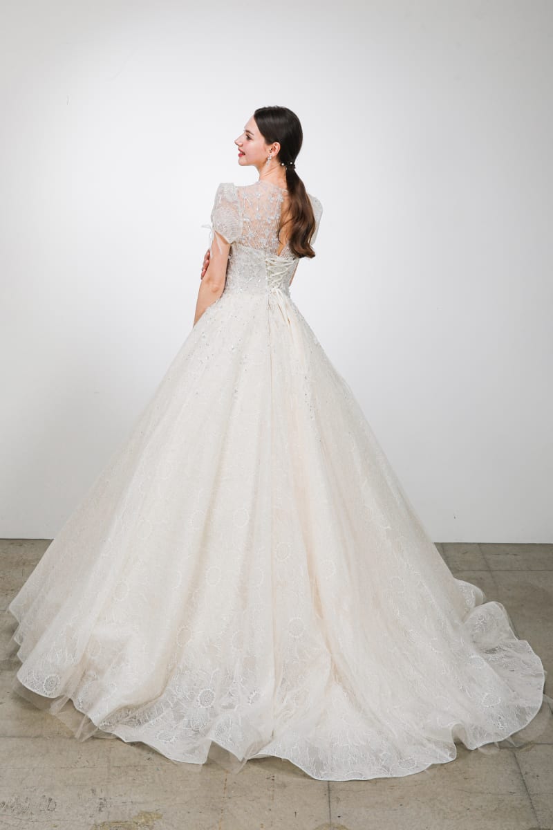 ふんわりと膨らむパフスリーブと3Dフワラーと放射線状に輝きを放つホワイトビーズと