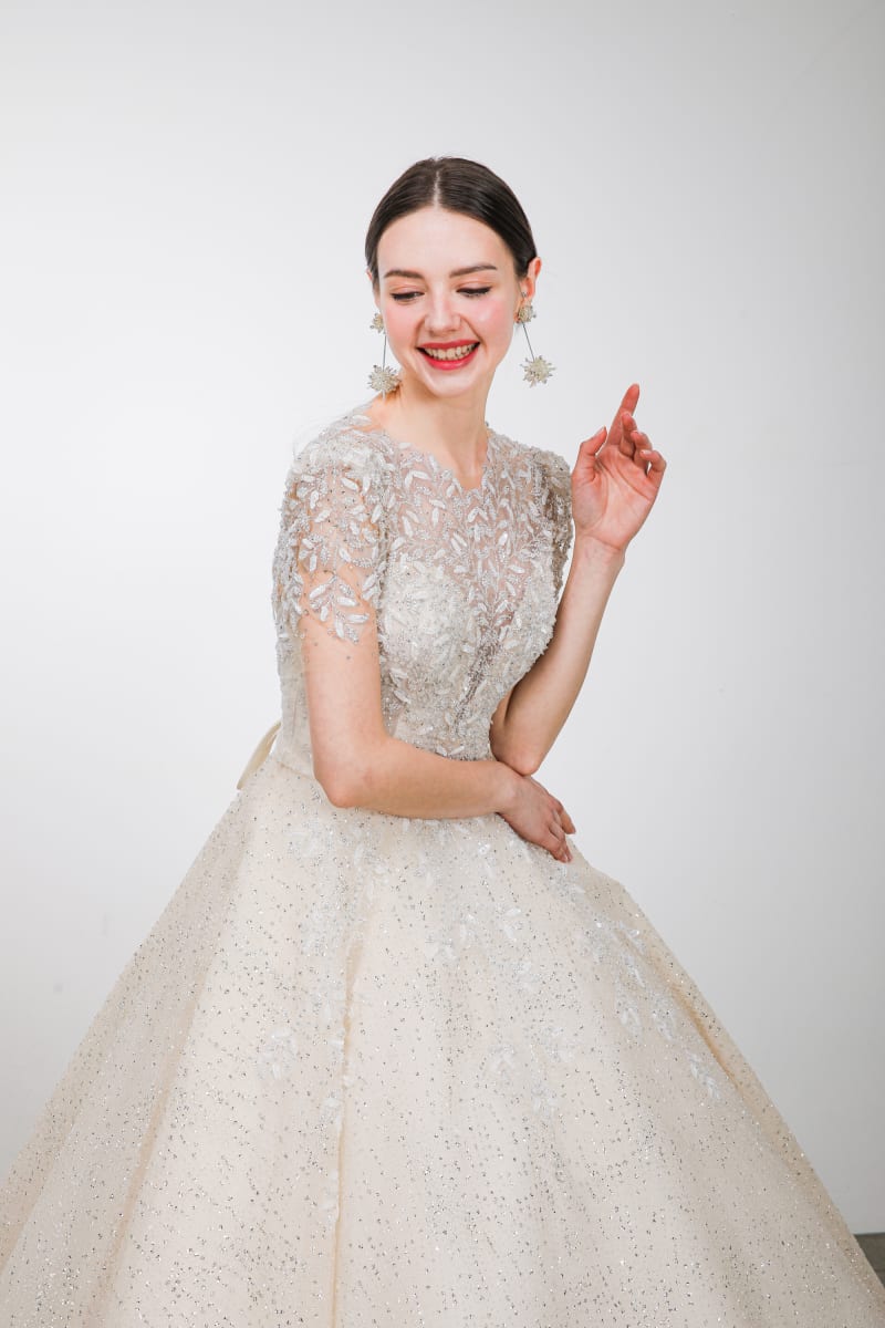 デコルテと袖を彩るリーフモチーフのビーディングがキラキラと輝き女性らしくエレガン